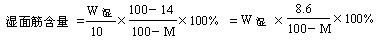 1、濕面筋含量是以每百克含水量為14%的小麥粉含有濕面筋的克數(shù)來表示的,如每百克試樣含水份克數(shù)為M(g),試樣質(zhì)量為10g,而濕面筋(包括篩上面筋和篩下面筋)稱得質(zhì)量為W濕(g),則濕面筋含量可按下列公式計(jì)算:
